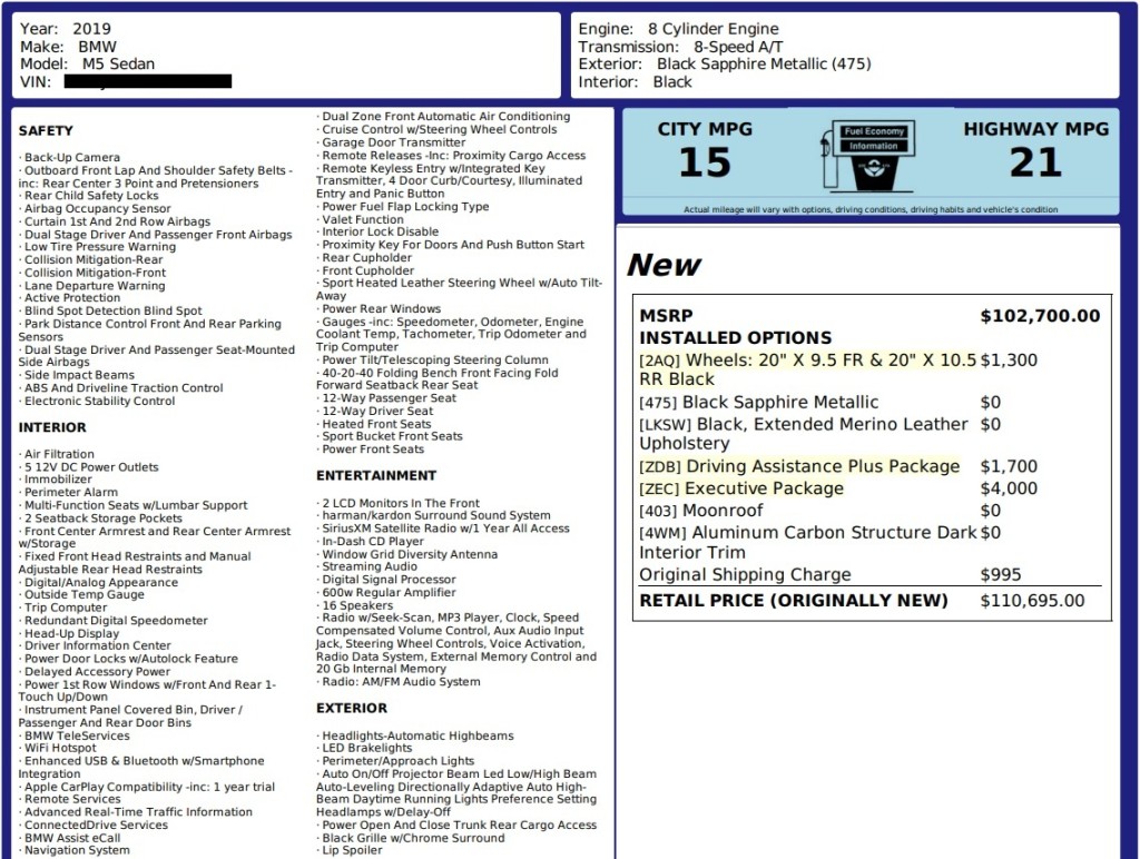 2019 BMW M5, 67K Miles / 107Km, CLEAN TITLE, MSRP $110695, Executive Package, Driving Assistance Package, Performance Exhaust *** Wholesale / EXPORT Price FOB Los Angeles CA ***